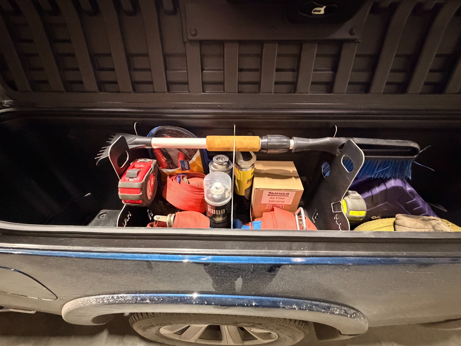 Больше не нужно вываливать всё содержимое бокса ради одной мелочи. Каждая вещь теперь имеет свое место – от гаечных ключей до буксировочных тросов.